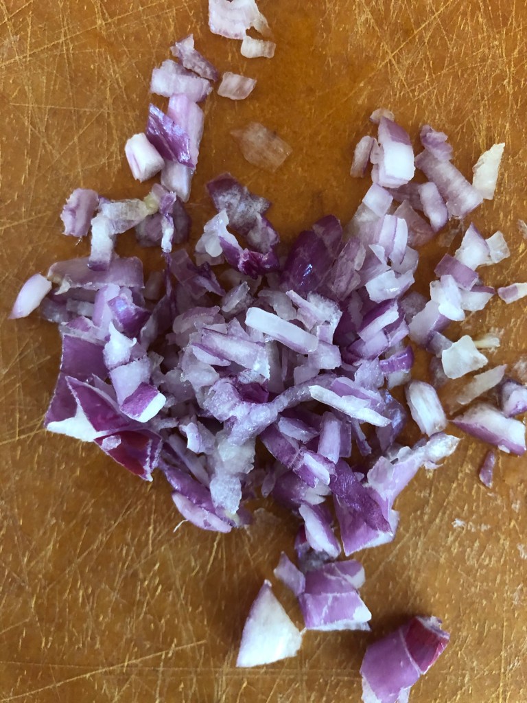 Whisk the mixture together really well and let it hang out while you finely chop up about half of a shallot. I hardly ever use measurements—the shallot amounted to about half of a handful. Throw them in the dressing, then open and drain a can of garbanzo beans. I like the organic from the 365 brand from Whole Foods—they’re always readily available and about $1. Throw them in the bowl and mix them really well to completely coat them with the vinaigrette. Put the whole bowl in the fridge—you want these as cold as possible!