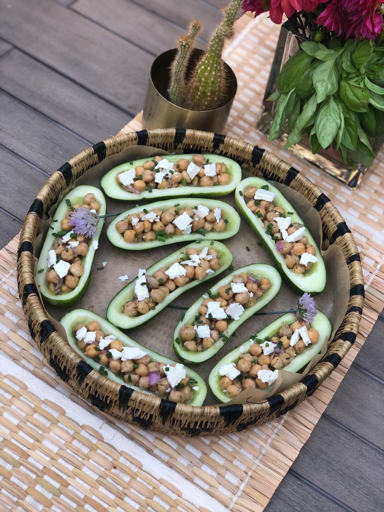 These cukes didn’t yield a ton of pulp, but if yours do, you can use it for smoothies (with apple and kale!) or for gazpacho (garlic, tomatoes, olive oil, bread). Go ahead and position the cucumbers on whatever serving dish you’re going to use, and get your bowl of marinating chickpeas from the fridge. Simply fill the boats with the garbanzo mixture and they can be ready to serve or they can back to the fridge until meal time.