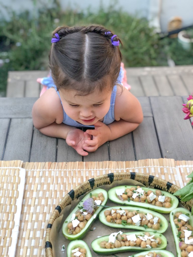I topped ours with fresh chives and chive flowers from the garden and slivers of feta. Fresh dill, fennel fronds, mint, lemon zest…the topping options are pretty much endless. Parent tip: if you’re planning on feeding these to toddlers, make sure to drain the chickpeas well before filling the boats. Our kids surprisingly enjoyed these—the 4-year old pretended the boat was sailing on his plate, and the 2-year old likes not having to fight the food with her knife and fork. I hope your family enjoys these as much as we did!